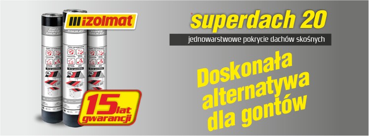 Papa wierzchniego krycia IZOLMAT Superdach 20 przeznaczona jest na dachy skośne o drewnianym podłożu. Zapewnia szczelne pokrycie już w jednej warstwie, przez co jest łatwa i szybka w montażu.